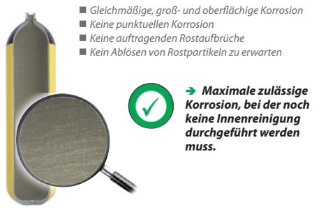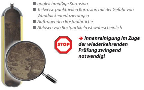 Risiko Druck (Zerknall): Ziel der Inneren-Prüfung durch denSachverständigen der ZÜS ist festzustellen, ob es punktuelle oder flächige Korrosionen gibt, die die drucktragende Wandung der Flasche bereits reduziert hat. Ob jedoch unter oberflächlich auftragenden Rostaufbrüchen bereits Abrostungen mit Reduzierung der Wandstärke vorliegen, lässt sich oft nicht ohne weiteres beurteilen. Daher wird in einem solchen Falle eine Innenreinigung durchgeführt. Hierdurch werden die auftragenden Rostaufbrüche vollständig entfernt und der eigentliche Abtrag der Wandung kann beurteilt werden. Hierzu sei auch angemerkt, dass insbesondere gewichtsoptimierte Atemluftflaschen („superleicht“) über fast keinen Korrosionszuschlag bei der Wandung verfügen. Das bedeutet, dass hierbei sehr genau geprüft werden muss, ob es zu abtragende Korrosion gekommen ist, da die Mindestwandstärke nicht unterschritten werden darf.